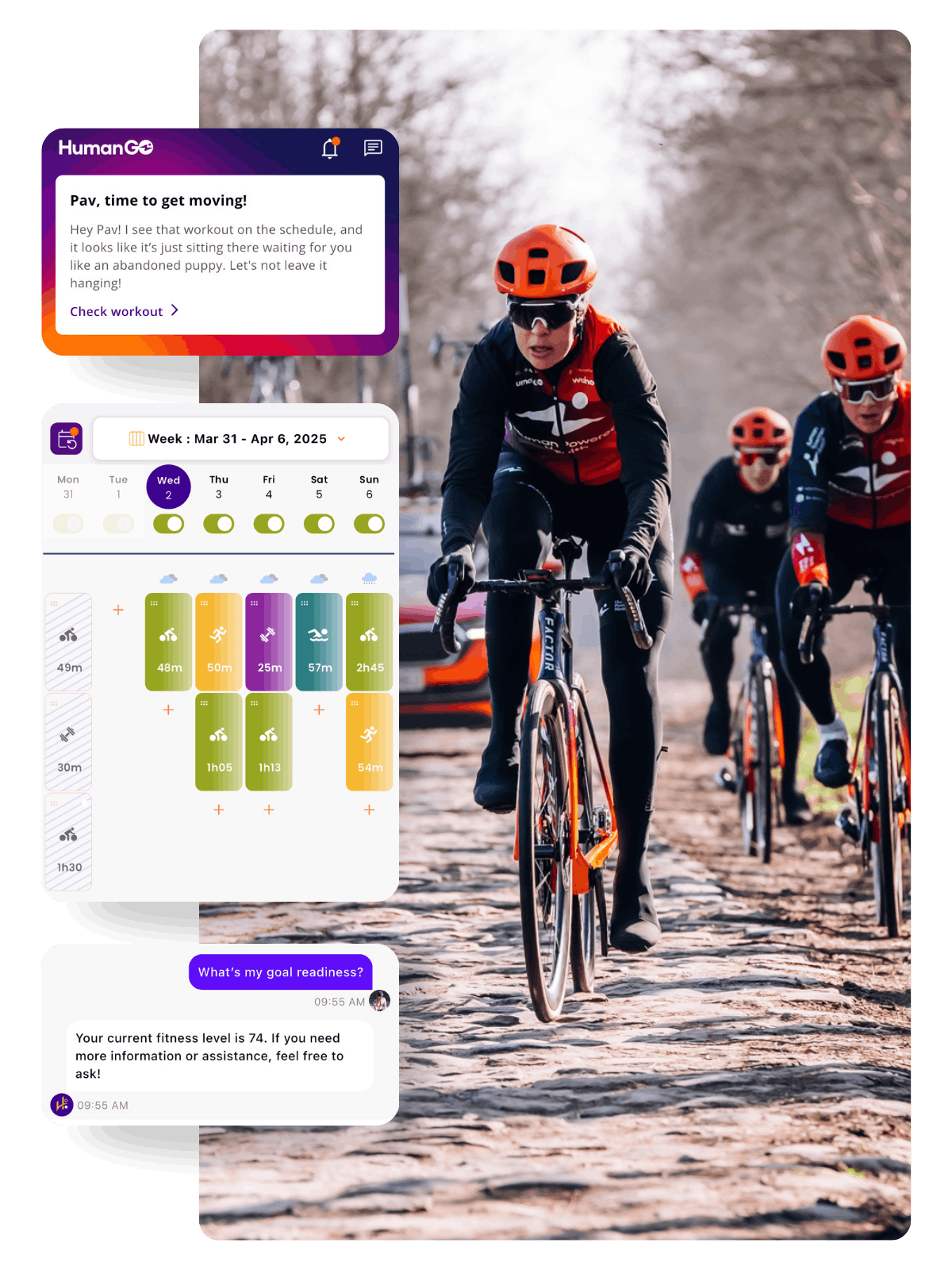 No two athletes are the same (and neither are their goals or schedules). HumanGO dynamically tailors your workouts and weekly structure based on your goals, sports preference, availability, life changes, and recovery needs. If you miss a session, get sick or injured, or overperform, your plan instantly adjusts to keep you on track without overloading you.