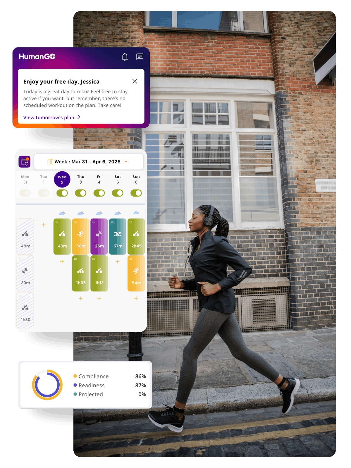 No two athletes are the same (and neither are their goals or schedules). HumanGO dynamically tailors your workouts and weekly structure based on your goals, sports preference, availability, life changes, and recovery needs. If you miss a session, get sick or injured, or overperform, your plan instantly adjusts to keep you on track without overloading you.