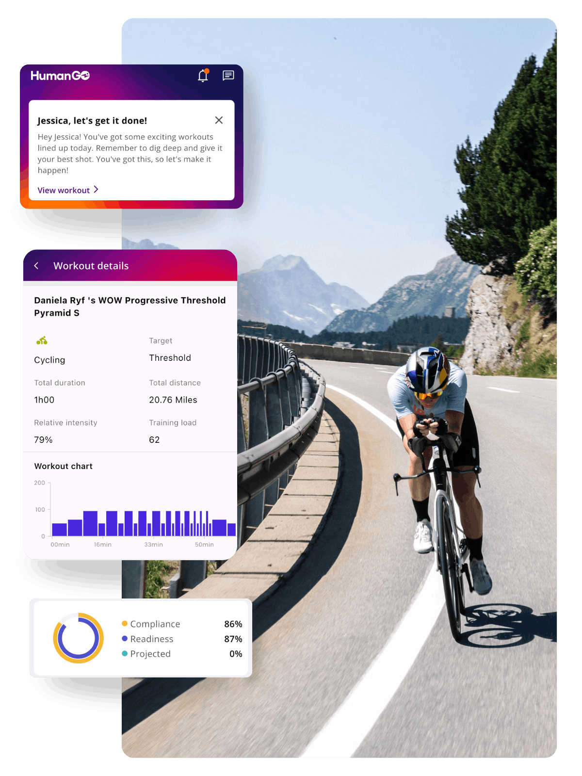 No two athletes are the same (and neither are their goals or schedules). HumanGO dynamically tailors your workouts and weekly structure based on your goals, sports preference, availability, life changes, and recovery needs. If you miss a session, get sick or injured, or overperform, your plan instantly adjusts to keep you on track without overloading you.
